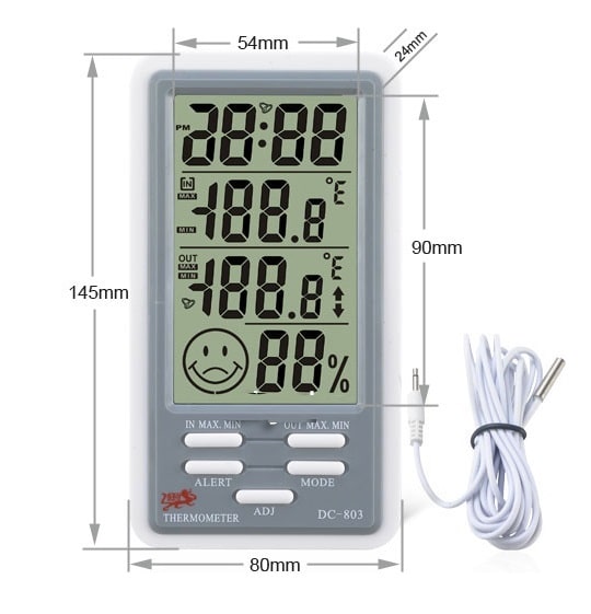 | ویژگی های خاص | دارای سنسور جداگانه برای تعیین دمای محیطی دلخواه علاوه بر تعیین دما و رطوبت محیطی که دماسنج در آن قرار دارد (به طور مثال تعیین تفاوت دمای دو محیط) و امکان تعیین بازه مجاز دمایی تا در صورت خارج شدن دما از این بازه آلارم دادن |